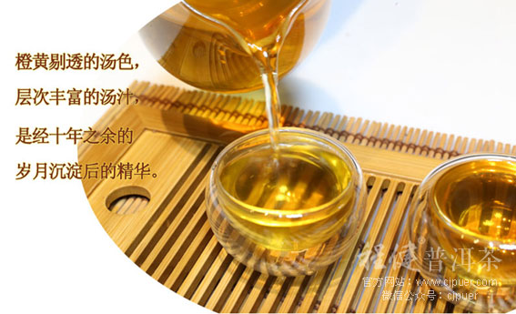 茶汤是鉴别内质丰富度的关键。台地茶茶汤内质不足所以表现为黄绿色,茶汤淡薄如水,喝进口中还会有烫嘴的感觉,这个感觉您可以仔细尝试,古树茶内质饱满,一样的热度,喝入口中,烫嘴的感觉区别很大,尝试一下吧,相信您会收获不少;古树茶茶汤均为金黄色,色泽通透明亮。注:茶汤粘稠度的鉴别请勿一点点茶汤喝入口中,就来判断,应该将茶汤稍试大口一些喝入口中,在口中迂回一周在咽下,一能感受其茶汤粘度,二能感受茶汤厚实饱满度及其顺滑感。