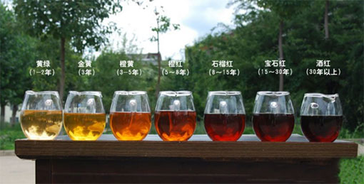 三、经过8年到15年左右时间的陈化的普洱熟茶,这个时期的普洱熟茶茶性较为温和,滋味丰富饱满,醇厚顺滑,香气纯正,汤色红浓透亮,显现酒红色,并且伴随时间的陈化,会出现类似荷香、枣香;或者桂圆香等香型。