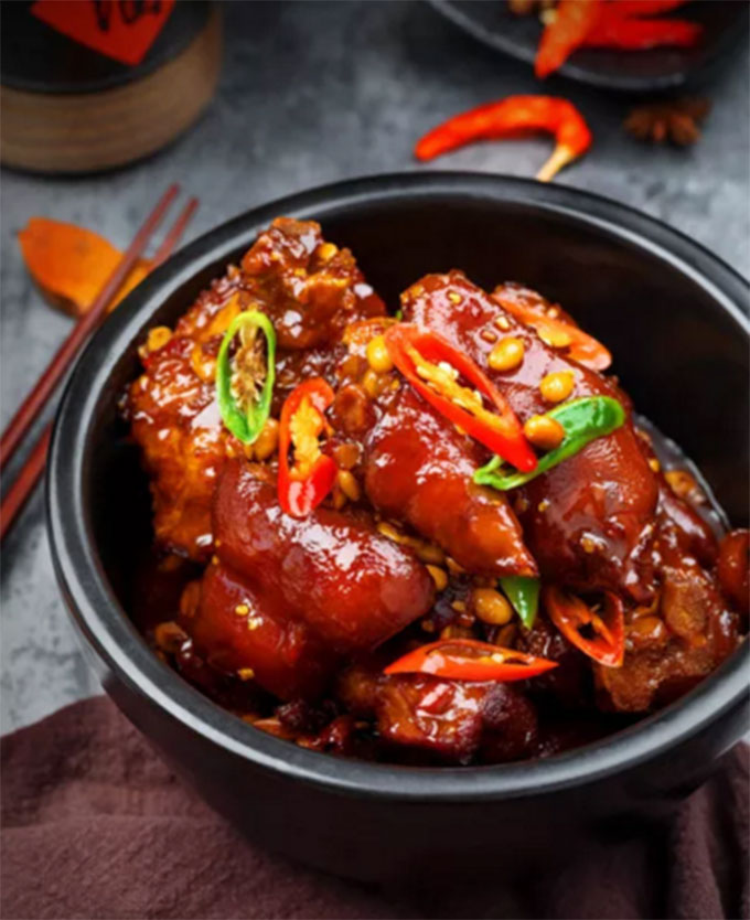 先用茶汤(去掉茶叶)浸泡猪肘,去其油腥,然后再入锅里焖。或者是直接在茶汤里加入各种酱料,然后放入猪肘文火慢炖。直至猪肘炖烂,茶香进入肉中。油腻的肘子和去油的普洱在这里奇妙合一,既解油腻又添茶香。