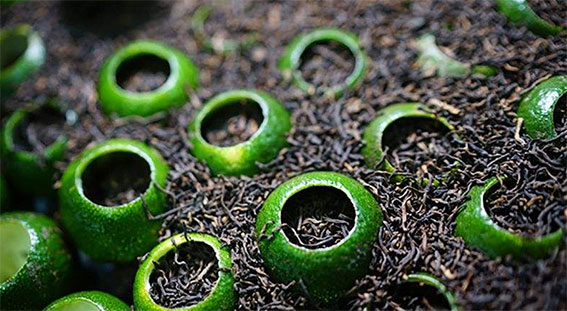 备一普洱茶刀,用茶刀在青柑仔四周及柑底部钻九孔,孔径大小以不漏碎茶为宜。再将其投入壶中,冲沸水,茶徐徐浸出,与柑皮的清香慢慢融合。口感清甜适度、耐泡,带孔的柑皮包裹着普洱茶,既无碎茶漏出,又可防止茶溶出速度过快。