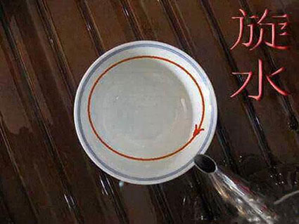 环圈注水顾名思义,指注水时水线沿壶盖或者杯面旋满一周,收水时正好回归出水点。注水时要注意着根据注水速度调整旋转的速度,水柱需细就慢旋,水柱粗就快旋。