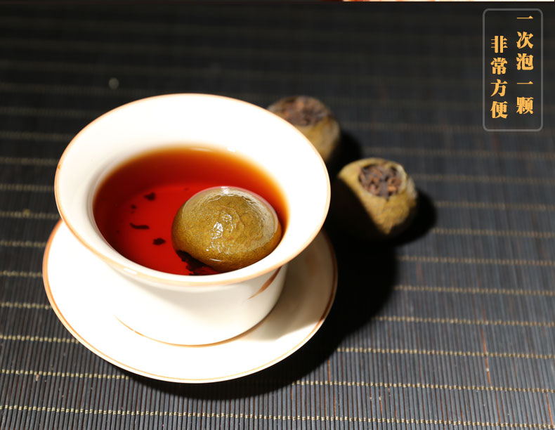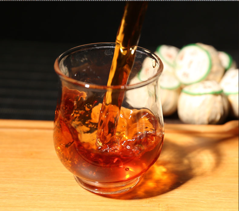 小青柑茶质纯净,融合了清醇的果香和普洱茶醇厚甘香之味,形成独特的口感与风味。冲泡后汤色橙红透亮,茶汤醇厚,汤感细腻,回味爽适有甜感,有浓厚陈香味。