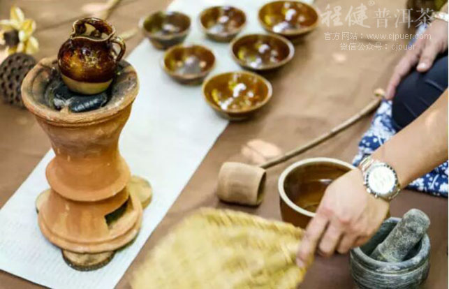 大体说,首先要将饼茶研碎待用,然后开始煮水。以精选佳水置釜中,以炭火烧开。但不能全沸,加入茶末。