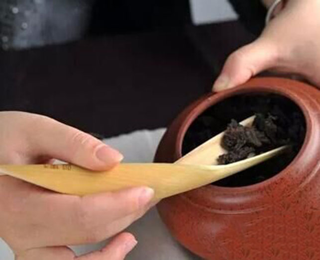 取用茶叶的时候,最好使用茶则。我们的手上有手汗、护手霜之类的气味,不要用手直接拿取茶叶,以免使茶叶吸附了杂味。