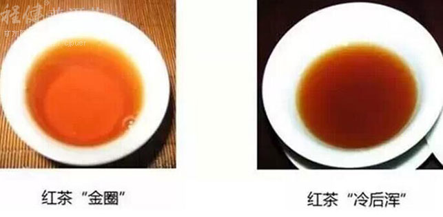 冷后浑、乳凝:红茶汤浓,冷却后出现浅褐色或橙色乳状的浑汤现象,称为冷后浑或乳凝,品质好的红茶出现这种现象。